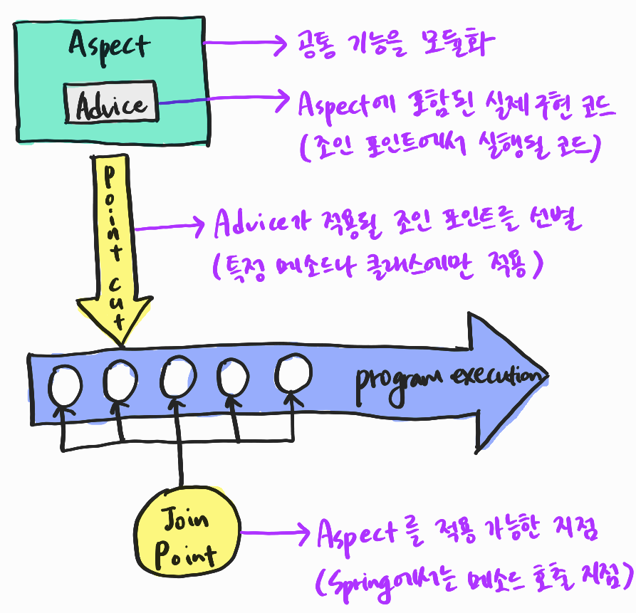 - Aspect(관점): 공통 기능을 모듈화한 것을 말한다. 예를 들어, 로깅 기능을 구현한 모듈이 Aspect이다.